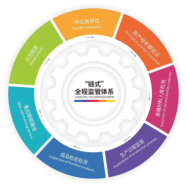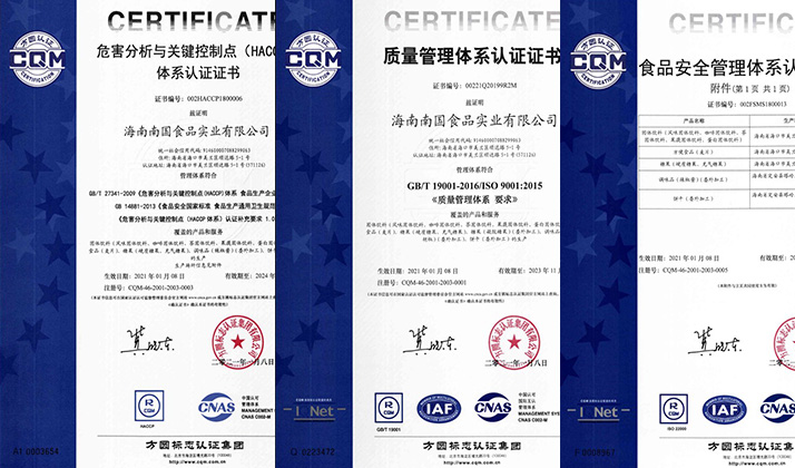 公司获得认证的治理系统有ISO9001质量治理系统、ISO22000食物清静治理系统、HACCP要害控制点与危害剖析系统,,,,,,,,从原辅料入厂、生产历程控制到产品出厂,,,,,,,,整个历程应用治理系统举行治理,,,,,,,,建设并实验各项制度文件,,,,,,,,有力地包管了产品的质量清静。。。。。公司还获得食物出口资质,,,,,,,,通过清真食物认证。。。。。